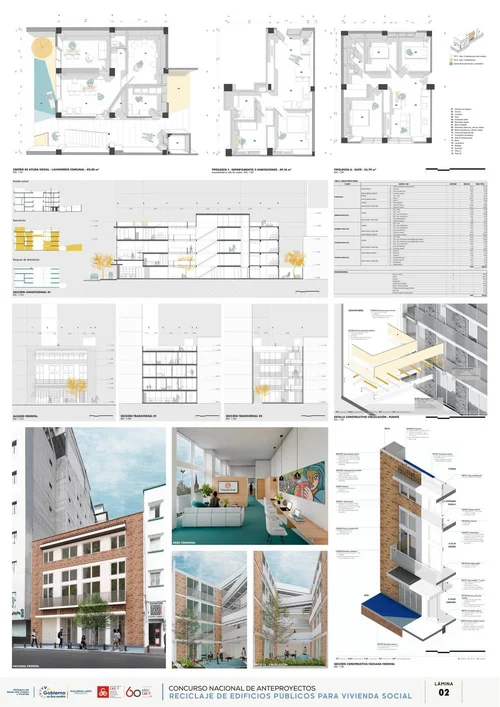 - Viviendas: buscando incrementar la densidad del sector, el proyecto alberga 12 unidades habitacionales de tipología monoespacio, y departamentos de 1, 2 y 3 habitaciones. Estas han sido pensadas para una diversidad de familias y necesidades a través del diseño de espacios sociales flexibles, cocinas abiertas que invitan a todos los miembros de la familia a participar de las tareas del cuidado, baños con funciones separadas, y habitaciones para camas simples o dobles. Se cuenta con dos viviendas de diferente tipología, diseñadas para personas en sillas de ruedas. La vivienda en planta baja del tercer bloque cuenta con un patio privado, sugiriendo que sea una casa de refugio temporal para mujeres víctimas de violencia, quienes en su proceso de sanación requieren de espacios menos expuestos.