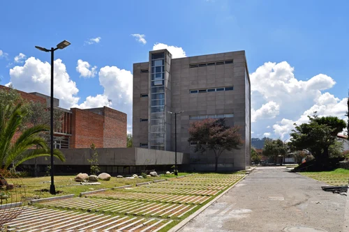 Junto con el encargo, se asume el reto de diseñar el edificio con elementos prefabricados de hormigón pretensado, novedoso sistema en nuestro medio para esta escala de proyecto, donde es más utilizado para obras de infraestructura ingenieril. El edificio se diseña así bajo criterios de modulación y eficiencia constructiva gracias al uso de elementos prefabricados como: zapatas, muros de contención, columnas, vigas cargadoras, losas TT y huellas-contrahuellas. El éxito del proyecto se logra gracias a la coordinación con el equipo de ingenieros desde la primera etapa de diseño, así se dibujan todos los detalles estructurales, arquitectónicos e instalaciones. Los elementos pretensados permiten alcanzar luces de hasta 9,5 metros con un peralte de solo 35 centímetros. El uso de elementos prefabricados izados con grúas y el control de un proyecto dibujado en su totalidad, permite la optimización de recursos y tiempos durante la construcción del edificio.
